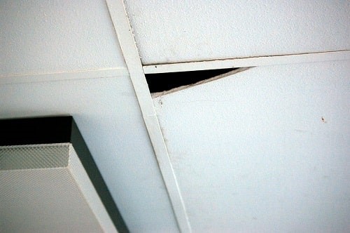 Broken ceiling tiles containing asbestos insulating board in a classroom. Any asbestos fibres would filter down into the classroom. From the report: Release of asbestos fibres in System Built Schools by Michael Lees, 2008.
