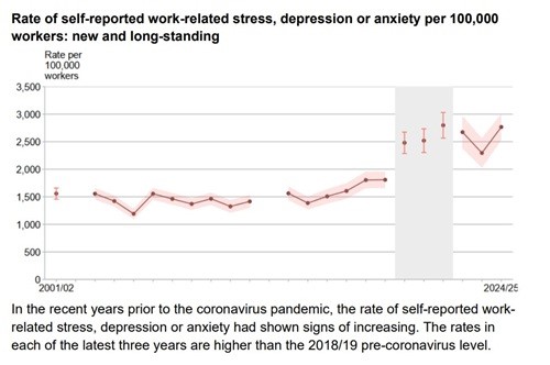 In the past three years since Covid however, the rates have accelerated. The rates for work-related mental ill health in each of the latest three years are higher than the 2018/19 pre-coronavirus level, standing at 2,770 cases per 100,000 workers (2.8%) in 2024/25.